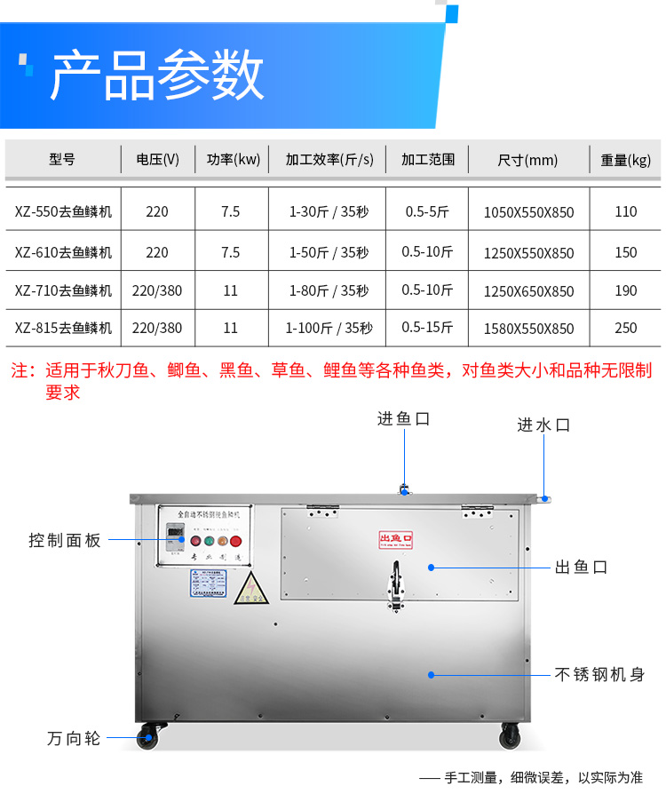 型號(hào) | XZ-550去魚鱗機(jī) | XZ-610去魚鱗機(jī) | XZ-710去魚鱗機(jī) | XZ-815去魚鱗機(jī) |